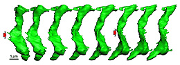 樹状突起の形は、シナプス信号の統合やニューロンの興奮性に影響することが知られているが、一見でたらめなパターンになっているように見える。今回、電子顕微鏡連続切片3次元再構成法を使って、4種類の形態が違う大脳新皮質介在ニューロン(非錐体細胞)の樹状突起の形を詳細に解析したところ、4種類の細胞に共通する2つの原理が明らかになった。1つ目は、樹状突起のの断面積は、その点よりも先端にある樹状突起の長さの合計に比例することである。この原理に相応して、樹状突起の分岐点では、分岐前の断面積と分岐後の断面積の合計はほぼ完全に一致していることもわかった。2つ目の原理として、樹状突起の断面は、細胞体に近い太い部分ほど、より扁平な楕円形であることがわかった。コンピュータ・シミュレーション解析をした結果、上述の普遍的形態特性が、細胞体に伝搬するEPSPの大きさが距離依存的に等しくなるというフィルター特性と、細胞体の脱分極電位が全樹状突起へ均一に伝播する現象のベースになっていることがわかった。これらの性質は、今回解析した樹状突起の形が違っているすべての介在ニューロンにあてはまることから、樹状突起の形に関する普遍的な原理であると考えている。