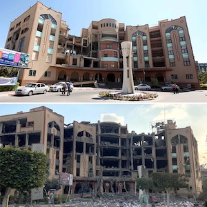 في الجامعة الإسلامية، أقدم المؤسسات المانحة للدرجات العلمية في القطاع، دُمرت 11 منشأة من منشآت الجامعة البالغ عددها 14، إثر موجتين من القصف في يومي التاسع والحادي عشر من أكتوبر الماضي. ومن بين المباني المدمَّرة، المختبرات العلمية، ومباني تقنية المعلومات، ومباني الكليات الطبية. صحيحٌ أنه عندما قُصفت الجامعة، كانت أبنيتها تخلو من الطلاب، البالغ عددهم 17 ألفًا، وأعضاء هيئة التدريس، وعددهم يربو على 300، إلا أن الكثيرين منهم قُتلوا أو جُرحوا في غارات أخرى، على حد قول أماني المقادمة، مديرة العلاقات الدولية بالجامعة.