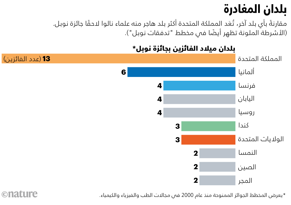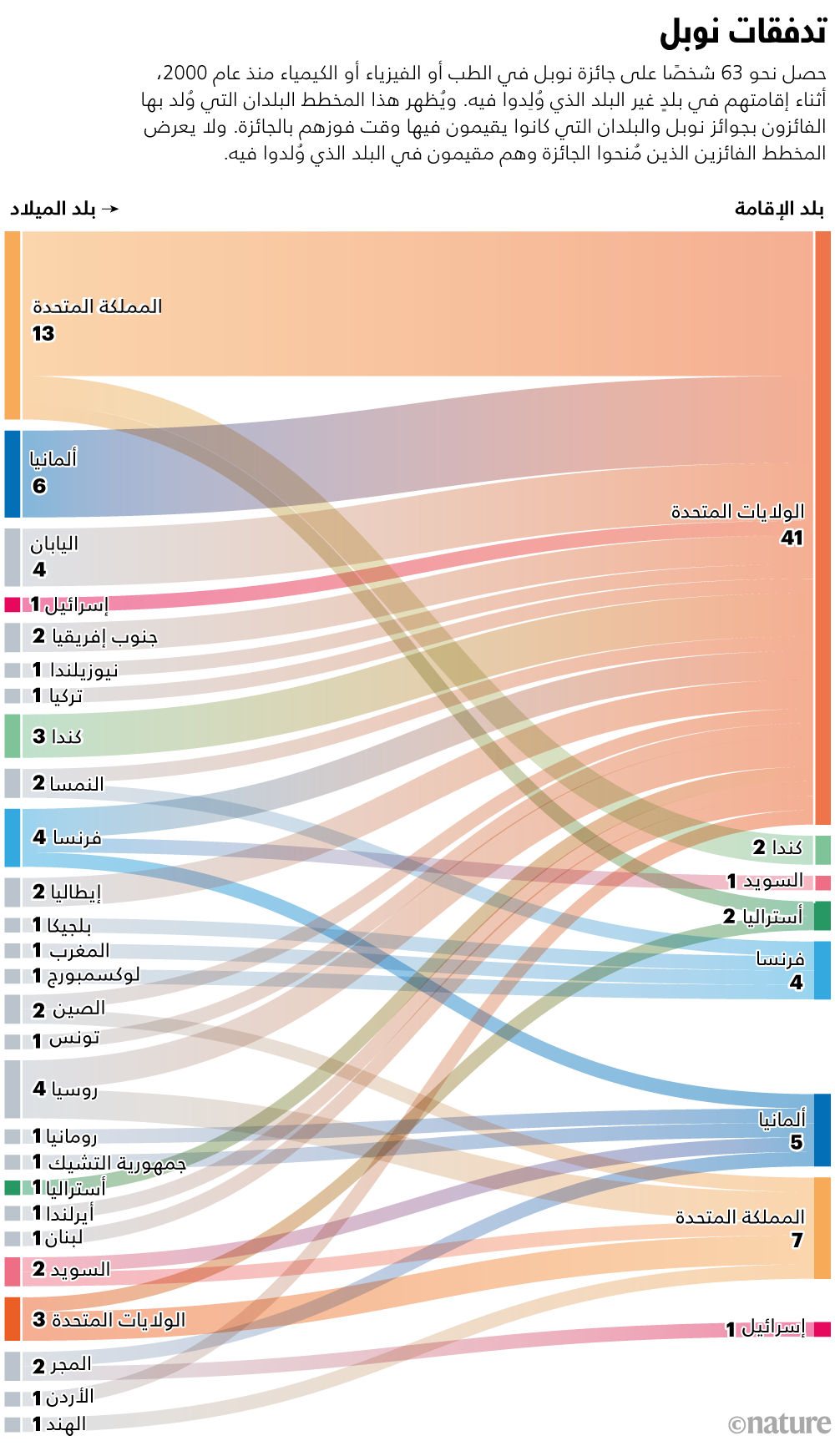 وفقًا لتحليل أجرته دورية Nature، ظلّت الولايات المتحدة منذ عام 2000 الوجهة الأكثر استقطابًا للعلماء المهاجرين الذين حصدوا في نهاية المطاف جوائز نوبل في الفيزياء والكيمياء والطب.