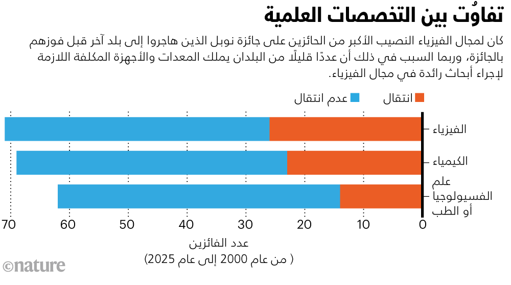 ومن بين الفائزين بجائزة نوبل الذين هاجروا إلى بلدان أخرى اثنان من أصل ثلاثة فائزين في مجال الكيمياء أُعلن عنهم يوم الأربعاء الماضي. فقد وُلد ريتشارد روبسون في المملكة المتحدة، ولكنه يعيش الآن في أستراليا. وأصبح عمر ياغي، المقيم حاليًا في الولايات المتحدة، أول عالم أردني المنشأ يفوز بجائزة نوبل في العلوم. كذلك فإن اثنين من الفائزين الثلاثة بجائزة نوبل في الفيزياء لعام 2025 يُعَدان من المهاجرين أيضًا: فميشيل ديفوريه، المولود في فرنسا، وجون كلارك، المولود في المملكة المتحدة، يقيمان في الولايات المتحدة.