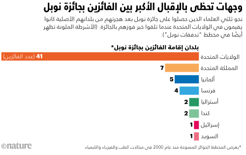وفقًا لتحليل أجرته دورية Nature، ظلّت الولايات المتحدة منذ عام 2000 الوجهة الأكثر استقطابًا للعلماء المهاجرين الذين حصدوا في نهاية المطاف جوائز نوبل في الفيزياء والكيمياء والطب.
