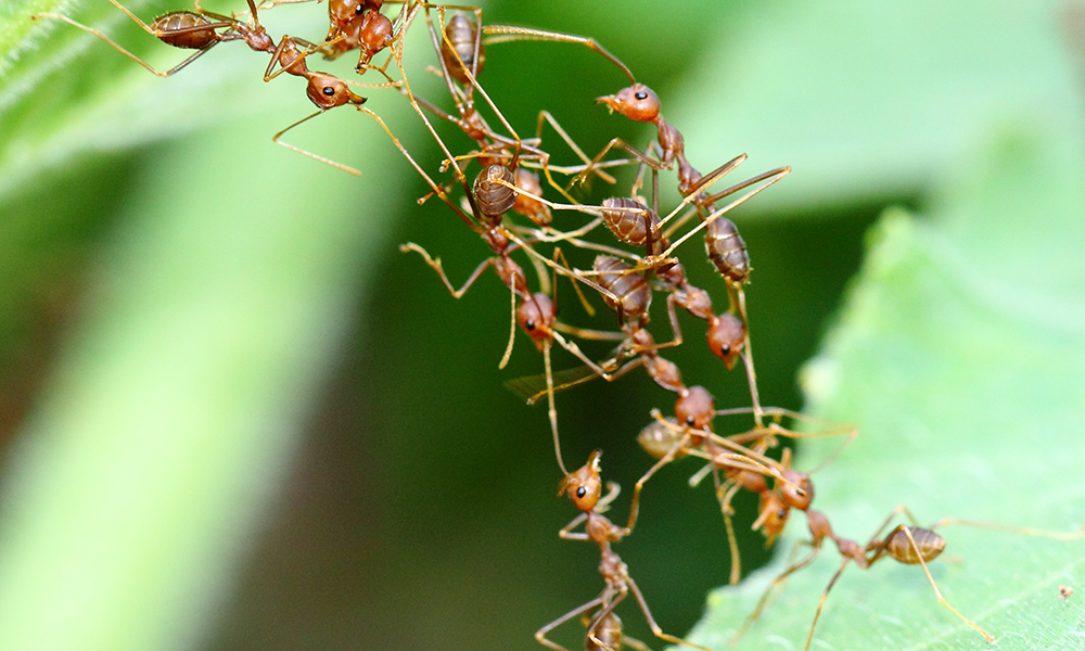 ツムギアリ(Oecophylla smaragdina)というアリが、効果的なチームワークの極意を教えてくれるかもしれない。研究者らは、このアリが集団で鎖状につながり、木の葉を引っ張って折り曲げて巣を作るときには、より大きな集団で作業をするほど、個々のメンバーの効率は向上すると報告した。