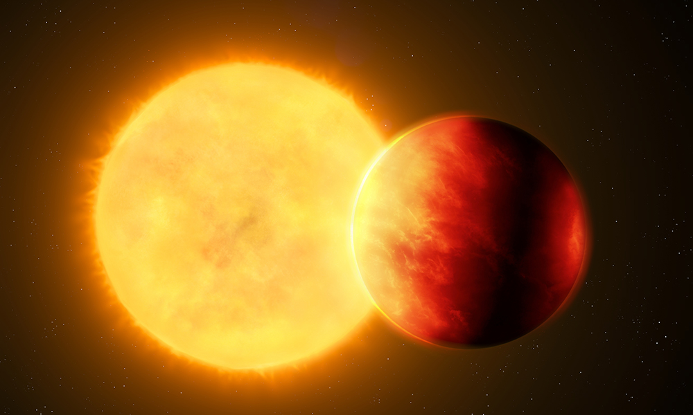 溶岩惑星(想像図)は、主星に非常に近い軌道を公転している特殊な岩石惑星だ。主星の重力による潮汐力で自転周期と公転周期が固定されているため(潮汐ロック)、常に同じ面が主星の方を向いている。この面の岩石は永遠の昼によって溶融し、マグマの海になっている。