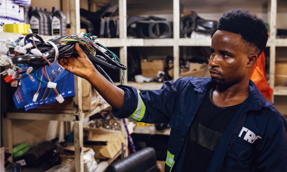 私は2022年にダルエスサラームのTRíという会社で働き始めました。TRíは電気三輪自動車の販売を通じて、三輪自動車をより持続可能で手頃な価格の移動手段にすることを目指しています。私たちは2024年にはE2という第2世代の車両を発売しました。E2は、従来の車両よりも航続距離が長く、標準コンセントから充電できる車載充電器を搭載しているなど、より優れた特徴を備えています。これまでに200台のE2を販売しました。
