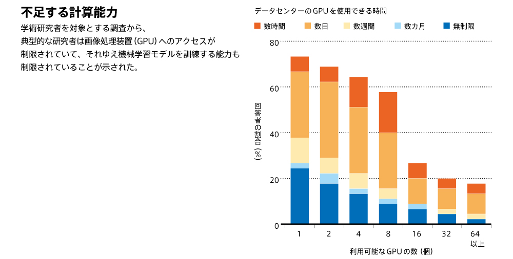世界の数十の学術機関に所属する人工知能(AI)研究者を対象とした調査により、彼らの多くが、AI研究に利用できる計算能力の大きさが限られていることに不満を抱いていることが明らかになった。