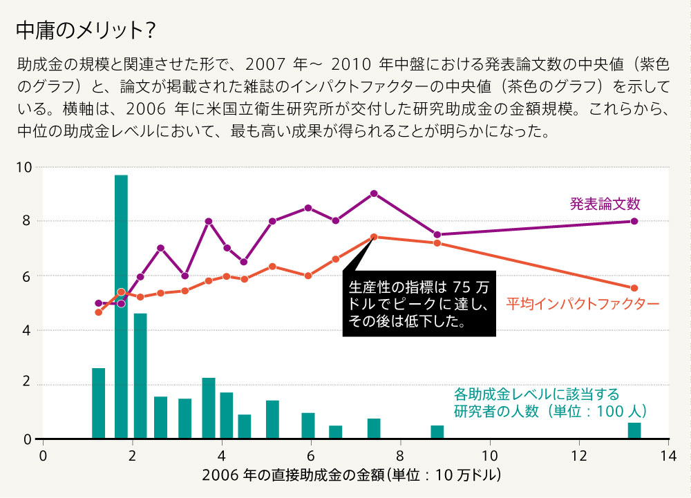 Bergの分析では、2006年にNIHから直接交付された研究助成金額をもとに、2938人の研究者を14グループに分類した。そして、2007年~2010年中盤までの発表論文数の中央値と、その論文が掲載された雑誌の平均インパクトファクターの中央値を、助成金額規模と関係付けてグラフ化した。