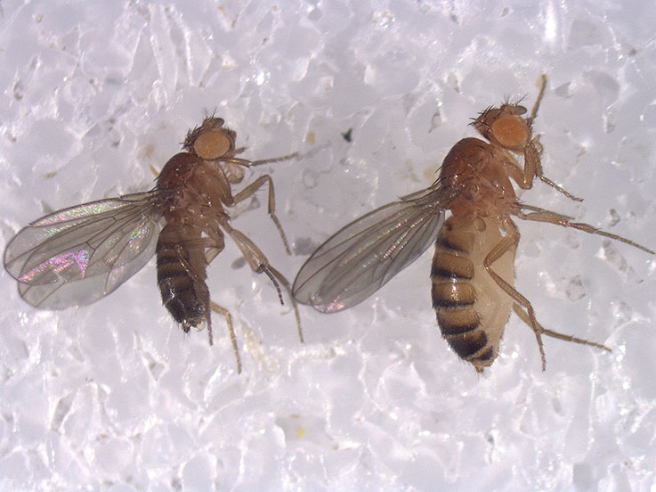 図1:ショウジョウバエの一般的な成虫(左)と、ロイヤラクチンを過剰発現させた個体(右)2。 Credit: Masaki Kamakura