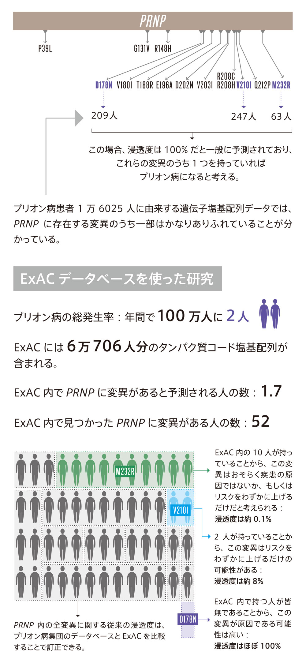 プリオン病は、折りたたみ異常型のプリオンタンパク質が原因で起こる希少な神経変性疾患である。プリオンタンパク質の遺伝子PRNPに生じる約63個の変異が、プリオン病と関連付けられている。しかし、任意のバリアントが疾患につながる可能性(「浸透度」という)を見積もることは、これまで難しかった。そこで役立つのが、ExACによってまとめられたデータだ。