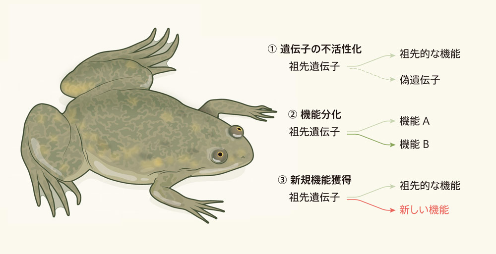進化の道筋をつなぎ合わせる作業は通常いくつかの異なる種を比較して行われるが、全ゲノム重複を経験した種では、その種だけを見て進化の過程を理解する機会が得られる。全ゲノム重複の後、同じ機能を持つ重複遺伝子は、時とともにいくつかの変化を遂げる可能性がある。例えば、一方のコピーで不活性化変異が生じたり(この変異が生じたコピーは遺伝子としての機能を失い、偽遺伝子となる)、共有されていた複数の機能が2つのコピーに分割されたり、一方のコピーが祖先的な機能を維持しつつもう一方のコピーが新たな機能を獲得したりする(図1)。十分な時間があれば、全ゲノム重複を経て四倍体になった生物も、全ての遺伝子が進化的に重要な独自の機能を有する二倍体の状態に戻る。この「再二倍体化」と呼ばれる過程は、脊椎動物の進化の過程で実際に何回か起きている2。