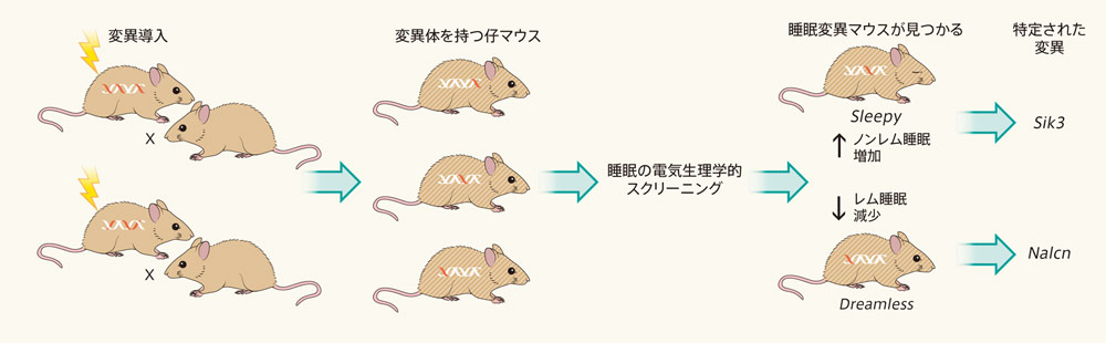 船戸たち1は、睡眠行動を調節する遺伝子の変異を探索するため、マウスを使って「順」遺伝学的スクリーニングを行った。順遺伝学的手法では、マウスのDNAに点突然変異(赤)をランダムに導入し、その変異マウスを野生型パートナーと交配し、生まれた仔を使って研究対象となる行動の変化を分析する。今回の研究では、著者らは、8000匹以上の仔マウスを使い、脳波と筋肉活動の電気生理学的測定を行うことによって睡眠を分析し、2つの家系を見いだした。Sleepyと名付けられた家系ではノンレム睡眠が増加している一方、Dreamlessと名付けられた家系ではレム睡眠が減少していた。その後に行われたゲノム塩基配列解読により、SleepyマウスではSik3と呼ばれる遺伝子に、DreamlessマウスではNalcn遺伝子に変異が起こっていることが分かった。