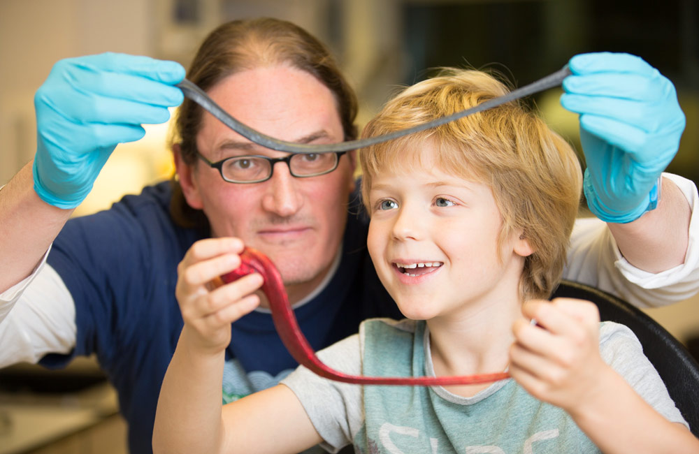 シリコーンポリマーにグラフェンを混ぜた「Gパティー」の試作品を手に持つダブリン大学トリニティ・カレッジの物理学者Jonathan Coleman。彼の息子Oisínが手に持っているのは市販のシリーパティー。 Credit: AMBER/Trinity College Dublin
