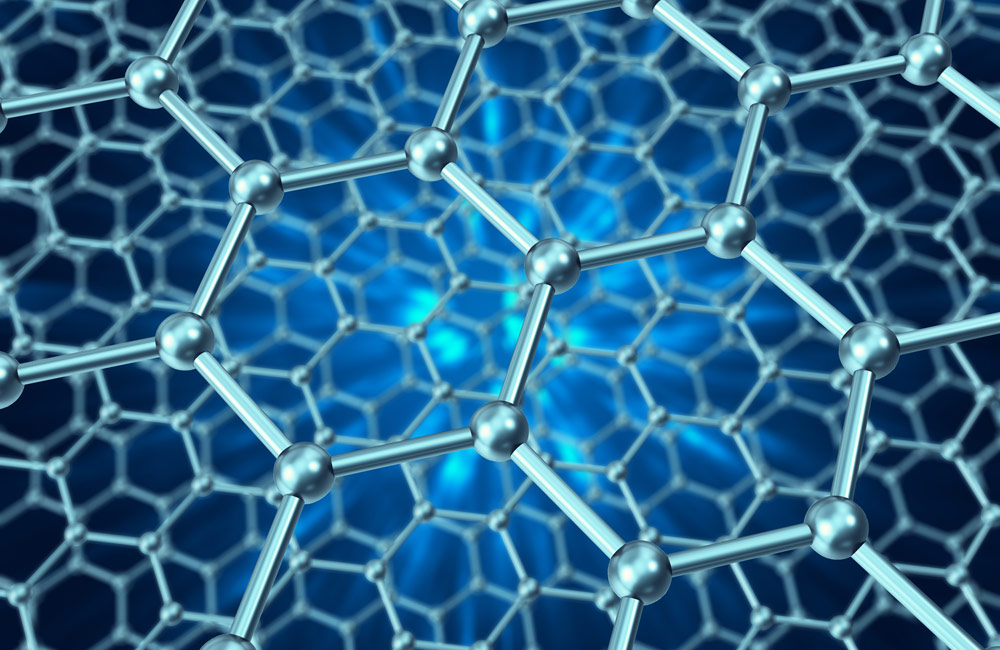 グラフェンの結晶構造を示したイメージ画像。Gパティー中では、グラフェンの無数の薄片が互いに接続して導電性のネットワークを形成している。 Credit: Rost-9D/iStock / Getty Images Plus/Getty