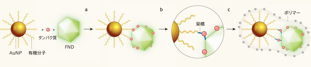 b. 次に、AuNP表面の有機基とタンパク質の間と、タンパク質とFNDの間に共有結合架橋を形成することによって、ハイブリッド粒子を安定化させた。