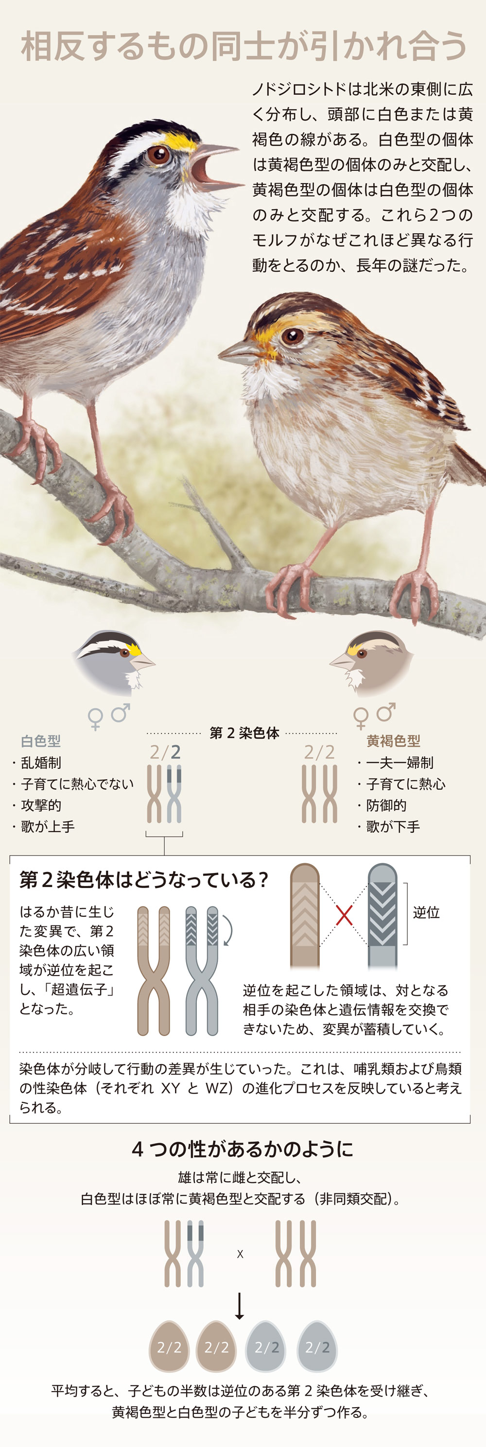 1つの大きな手掛かりが、すでに文献にあった。1966年に鳥類学者H. B. ThorneycroftがScienceに発表した論文2で、ノドジロシトドの奇妙な染色体対のことを指摘していたのだ。黄褐色型は第2染色体の同一コピーを2本持っているが、白色型では一方のコピーに逆位部分がある。まるで、広い領域をハサミで切り取り、そこを180度回転させて戻したような配列になっているのだ。これほど大規模な染色体逆位は脊椎動物ではめったに見られないと、Thorneycroftは記していた。調査した個体群では、非同類交配によって2つのモルフが等しい比率で維持されているようだった。メンデル遺伝では平均して、白色型と黄褐色型のペアの子どもの半数が逆位のある第2染色体を1コピー受け継ぐからだろう。しかし、これが事実だと証明するには、さらなる研究が必要だと考えられた。