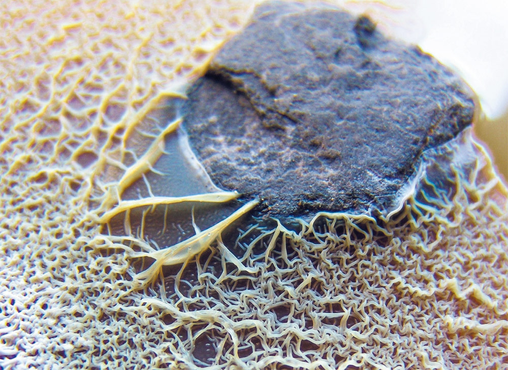 ストレプトミセス属(Streptomyces)細菌は、主に土壌を生息域としており、多くの抗生物質がストレプトミセス属の産生物である。マックマスター大学(カナダ・ハミルトン)のMarie Elliotらは、ストレプトミセス・ベネゼエレ(Streptomyces venezuelae)をパン酵母(Saccharomyces cerevisiae)と14日間にわたって共培養した。すると、この細菌が分岐を伴わない栄養菌糸を形成して、さまざまな表面(写真)や障害物を覆って広がることが分かった。この「探索」細胞は、揮発性アルカリ性化合物を放出して、物理的に離れたストレプトミセス属細菌を刺激して探索を開始させるが、他の細菌の生育は阻害する。