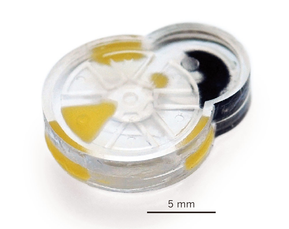 コロンビア大学(米国ニューヨーク)のSau Yin ChinとSamuel Siaらは、生体適合性ヒドロゲルを使って、直径わずか1cm強の超小型デバイスを製作した(写真)。弁、ポンプ、回転する歯車など、さまざまな可動部を持つ多様なバージョンのデバイスが、1層ずつ設計された。