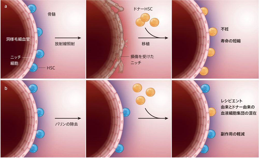 a. マウスでの従来の骨髄移植では、レシピエントの造血幹細胞(HSC)の除去に放射線照射が用いられるが、これにより洞様毛細血管(骨髄の小血管に隣接するニッチで、ここでHSCが増殖する)も損傷を受ける。次に、健康なドナーHSCが骨髄に移植されると、血液系が完全に再構築される。この手法は造血系の置換に有効であるが、不妊や寿命の短縮を引き起こす。