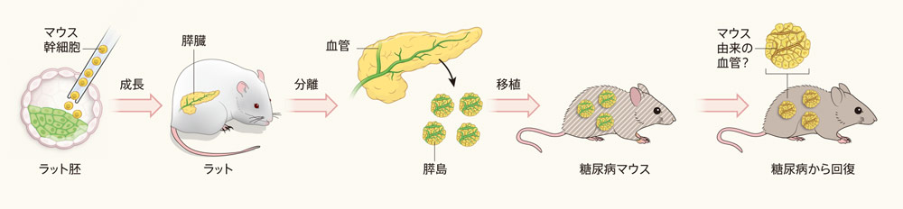 山口ら1は、膵臓発生のマスター調節因子であるPdx1遺伝子を欠損するラット初期胚に、マウスの多能性幹細胞を注入した。この手法で作製されたラットは通常、全ての組織においてラットとマウスの両方に由来する細胞系譜を含むが、この胚では、膵臓はマウスの細胞からできる。膵臓は、マウス由来の細胞(黄色)と、両方の種の細胞系譜が混在した血管や一部の支持組織(緑色)から構成される。このラット由来のマウス膵臓から、インスリン分泌細胞を含む膵島と呼ばれる細胞クラスターを分離し、それを1型糖尿病モデルマウスに移植した。移植された膵島は、糖尿病によって生じる高血糖を抑制した。この膵島のラット由来血管は時間の経過とともに消失したが、おそらくこれはレシピエントマウス自身の血管によって置き換えられたと考えられる(図は引用文献1より)。