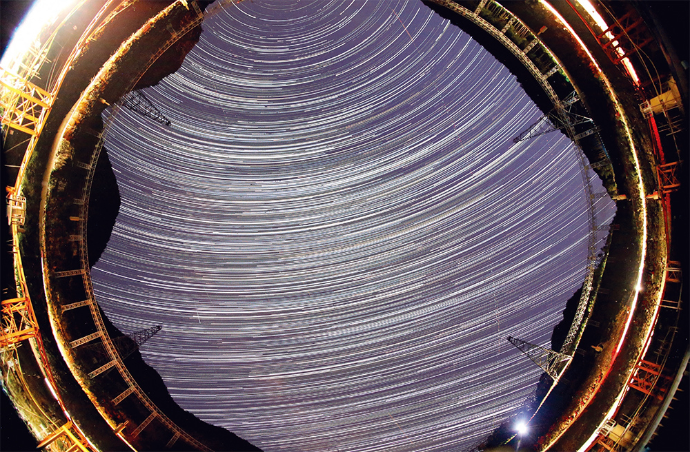 中国貴州省にある500メートル球面電波望遠鏡から見た夜空。この望遠鏡もパルサーを観測し、重力波の兆候を捉えた。 Credit: NAOC of CAS