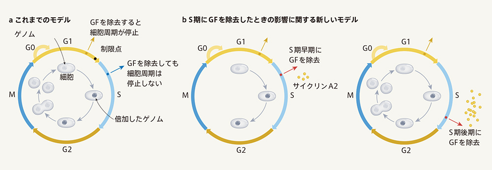a 細胞分裂へ向かう細胞は、細胞周期のG1期、S期、G2期、M期という段階を順に進み、S期でゲノムを複製し、M期で分裂する。これまでのモデルでは、DNA複製前のG1期に、不可逆的な「制限点」が存在するとされていた。細胞がG1期の制限点を通過する前に増殖因子(GF)を除去した場合、細胞は分裂せず、G0期(静止期)と呼ばれる非増殖状態に戻る。一方、制限点を通過してから増殖因子を除去すると、細胞は後戻りせずに増殖サイクルを完了すると考えられてきた。