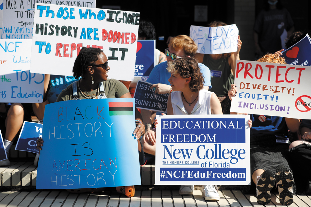 ニューカレッジ・オブ・フロリダは、DeSantisが2023年1月に数名の理事会メンバーを任命し、イデオロギーの徹底的な見直し(ある理事は、これを「保守派による反革命の幕開け」と呼んだ)を断行したことで大混乱に陥った。ニューカレッジの全てのDEI計画は直ちに中止され、その直後には学長が解雇され、5人の教員がテニュアを拒否された。新たにニューカレッジの学長に任命されたRichard Corcoranのメモによれば、「当カレッジを、より伝統的なリベラルアーツ教育機関へと移行させるという、新たな目的」のための人事であるという。テニュアを拒否された教員には、化学者2名と海洋学者1名が含まれている。彼らは全員、1年早くテニュア申請を行っていたので、希望するなら来年再申請することができるという。