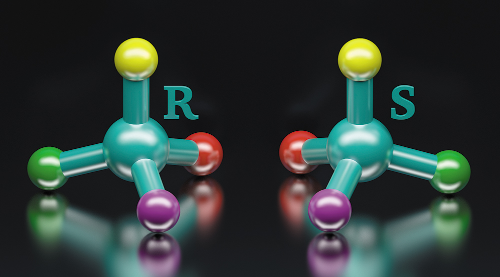 互いに鏡像の関係にあって重ね合わせることのできない鏡像異性体(エナンチオマー)は、その立体配置に基づいてそれぞれ「R体」「S体」と呼ばれる。 Credit: DariaRen/iStock/Getty