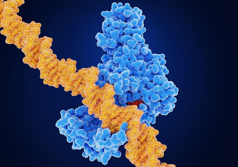 DNAメチルトランスフェラーゼ(青色)がDNA(黄色)をメチル化(赤色)している様子。 Credit: Selvanegra/iStock/Getty