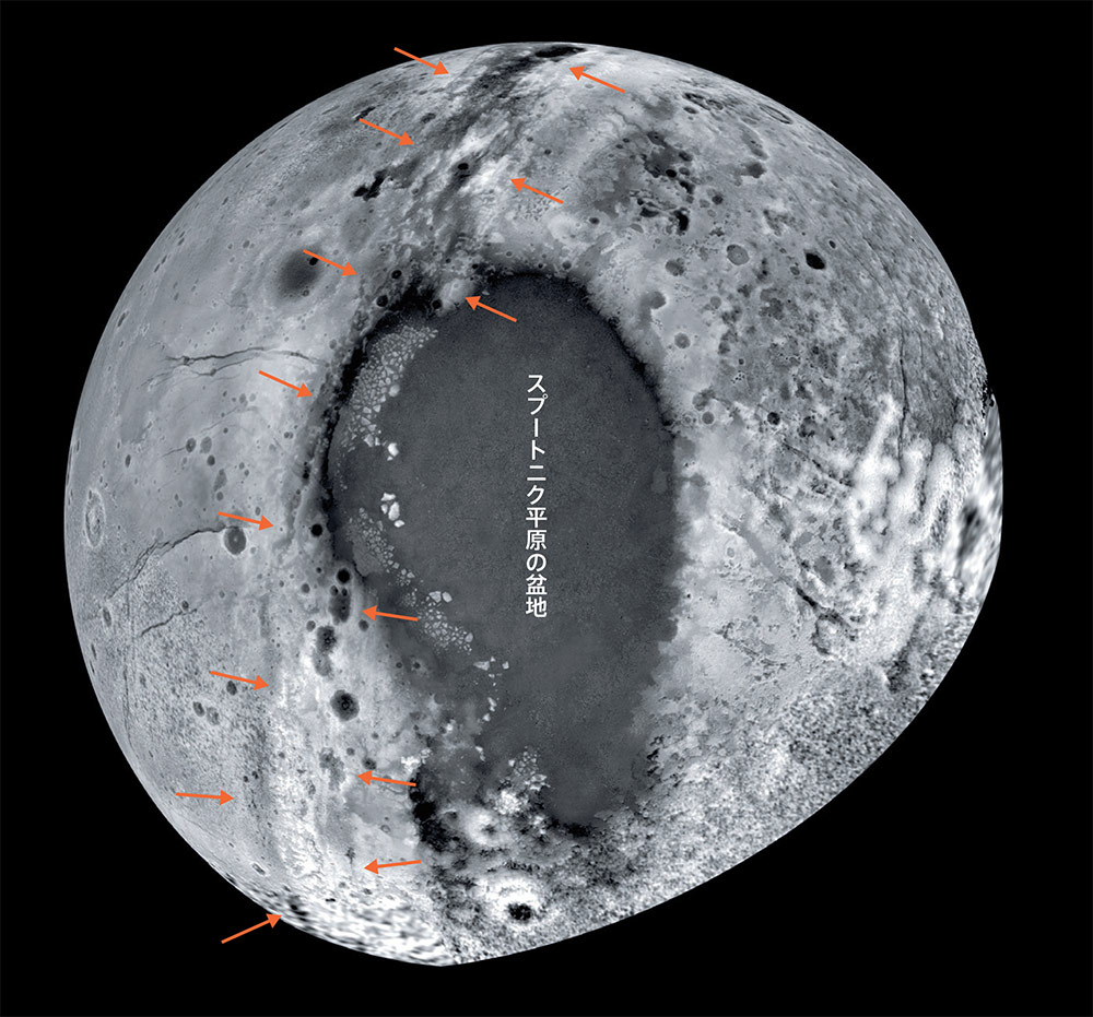 冥王星の「表側」の最初の画像が地球に到着してからすぐに、カリフォルニア大学サンタクルーズ校(米国)の惑星科学者Francis Nimmoらは、スプートニク平原が奇妙な場所にあることに気付いた。スプートニク平原は、冥王星の最大の衛星カロンのほぼ正反対の位置にあるのだ。単なる偶然かもしれないが、偶然である可能性はわずか5%にすぎない。モデル研究からは、この盆地が形成されたときに、巨大な裂け目の中に地下の海水が湧き出してきたことが示唆された。その後、冥王星の大気中の窒素ガスが、極寒の盆地の中で凝結して氷になった。このようにして集まった水と氷の重さによって冥王星の自転軸が傾き、現在のような横倒しの状態になったという2。