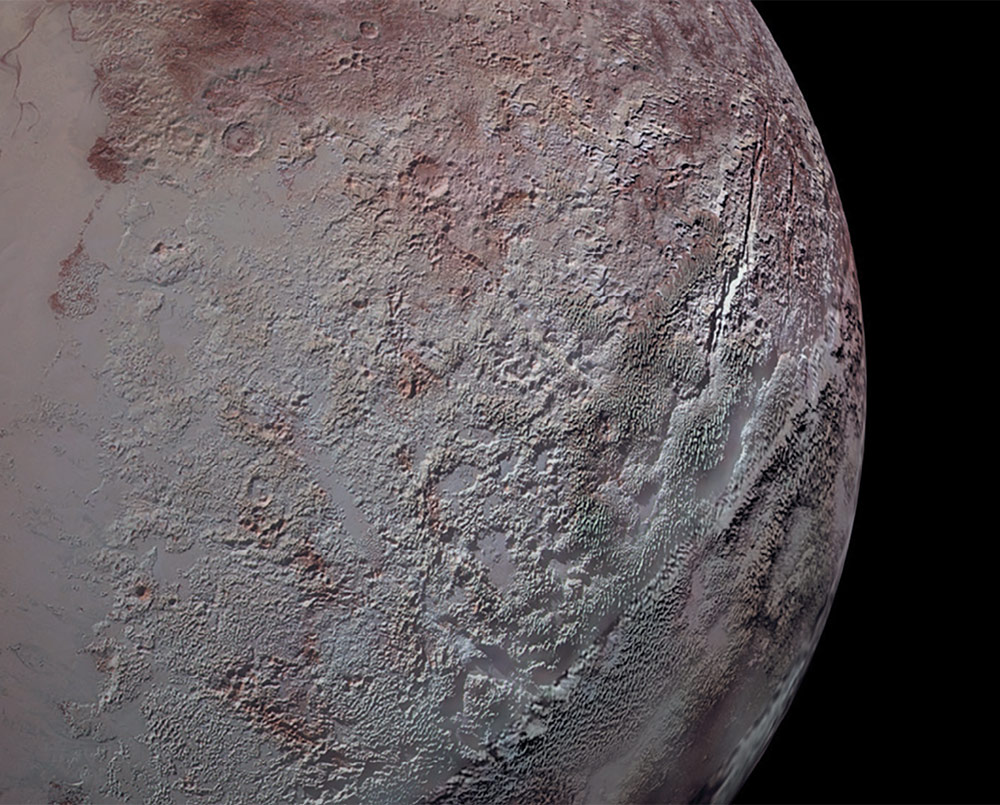 冥王星の「表側」の画像の右側には、巨大なメタンの氷が隆起した「刃状領域」が広がる。 Credit: NASA/JHUAPL/SwRI