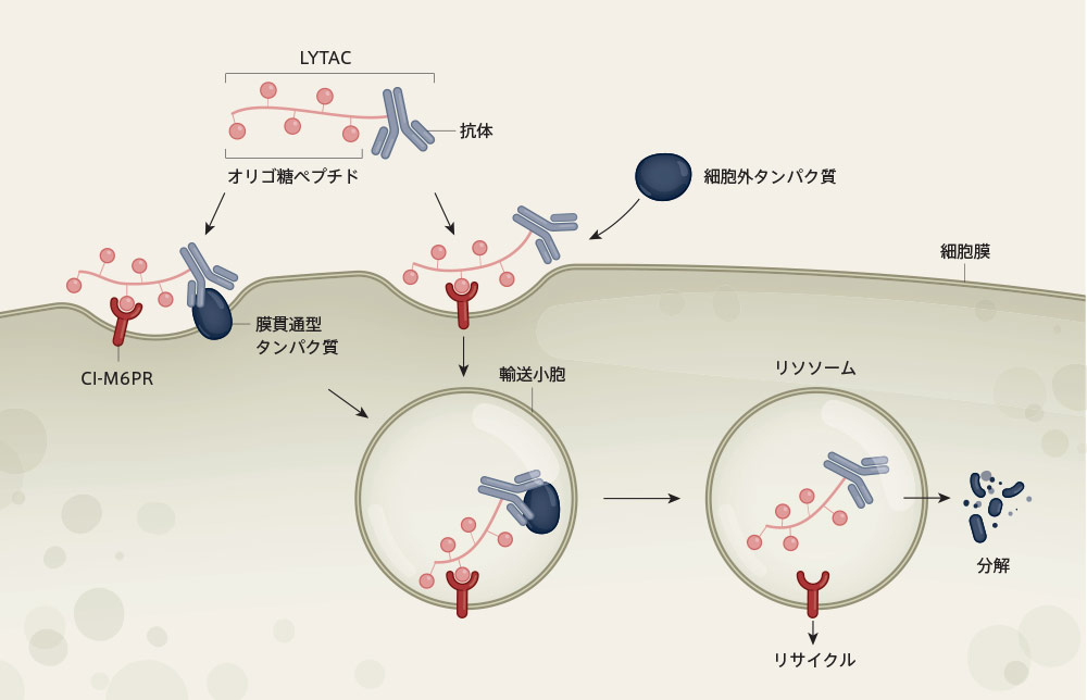 Banikら4は、オリゴ糖ペプチド部分(細胞表面受容体CI-M6PRに結合する)と、特定の膜貫通型タンパク質あるいは細胞外タンパク質に結合する抗体で構成されるLYTAC分子について報告している。抗体は、タンパク質に結合する小型分子(図示していない)で置き換えることもできる。LYTACがCI-M6PRと標的タンパク質の両方に同時に結合すると、その結果生じた複合体が細胞膜に包み込まれて、輸送小胞を形成する。輸送小胞により、この複合体はリソソーム(タンパク質分解酵素を含む細胞小器官)に運ばれる。標的タンパク質が分解されると、受容体はリサイクルされる。LYTACも分解されるかどうかは分かっていない。LYTACは治療への適用で有用な可能性がある。