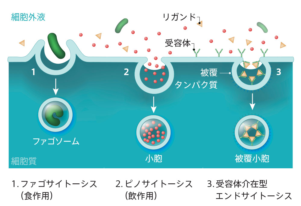 エンドサイトーシスは、細胞が細胞膜を陥入させて細胞外の物質を取り込むシステム。細菌などの異物を取り込むファゴサイトーシス、液体(栄養などの物質が含まれている)を取り込むピノサイトーシス、受容体介在型エンドサイトーシスに大きく分けられる。取り込まれた物質は、リソソームに運ばれて分解される。受容体介在型エンドサイトーシスを利用したLYTACは、標的の細胞外物質や膜貫通型タンパク質を細胞内に取り込ませ、分解させることができる。 Credit: ttsz/iStock/Getty