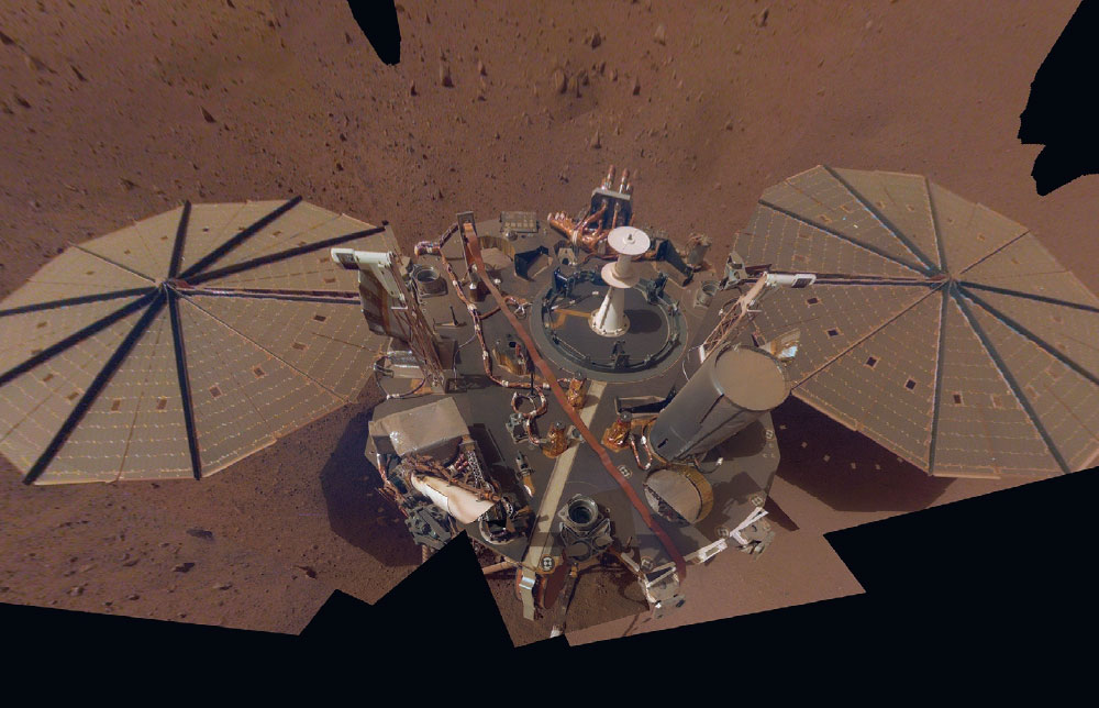 2019年3月、地震計の設置を終えたインサイトが撮影した自撮り写真。全体にうっすらと塵が積もっている。 Credit: NASA/JPL-CALTECH