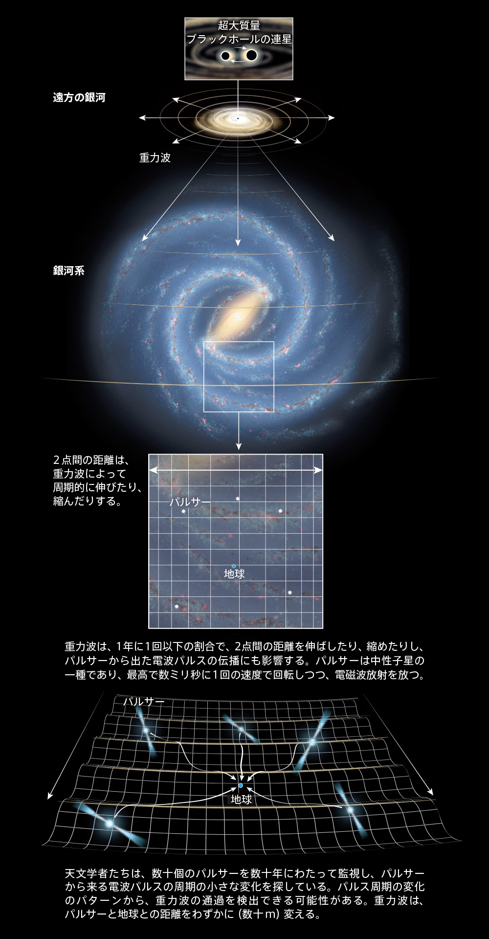 一方、IPTAのパルサーを使った検出方法は、周期が1年〜数十年という、ずっと低い周波数で振動し、はるかに長く続く重力波の検出を目指す(「重力波のスペクトル」参照)。こうした重力波は主として、長期に互いの周囲を回るブラックホール対から生じるとみられる。大きな銀河の多くは、中心に超大質量ブラックホールを持っていると天体物理学者たちは考えている。2つの銀河が合体すると、銀河の中心にあったブラックホールはやがて新たに形成された銀河の中心に沈み、互いの周囲を回り始める。2つのブラックホールが十分に近づけば、強い重力波を放つだろう。