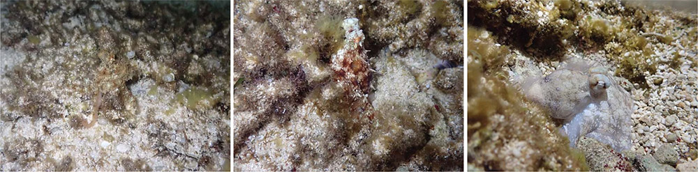 野外で撮影されたソデフリダコの写真。覚醒時は左・中央の写真のようにさまざまな体表模様が現れる。静的睡眠時は、右の写真のように全身が白くなり、ほとんど動かない。約45分おきに、突然、覚醒状態様の睡眠状態(動的睡眠:AS)になる。 Credit: 浅田渓秋(OIST技術員)