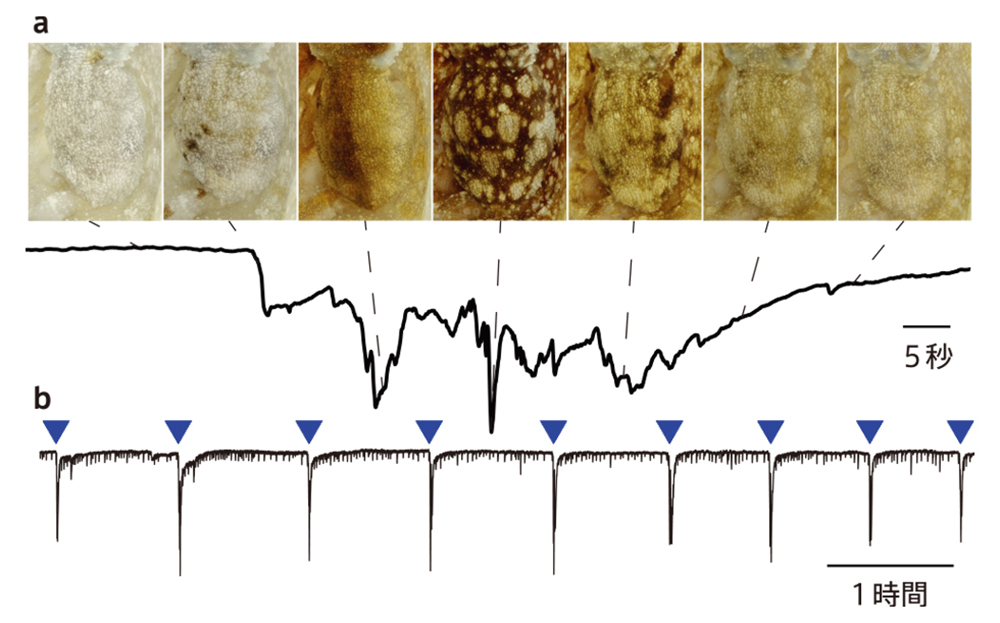 b ここではaの下段と同様に睡眠中の体表色変化を長時間にわたり定量化している。矢頭で示すASが定期的に現れることが分かる。