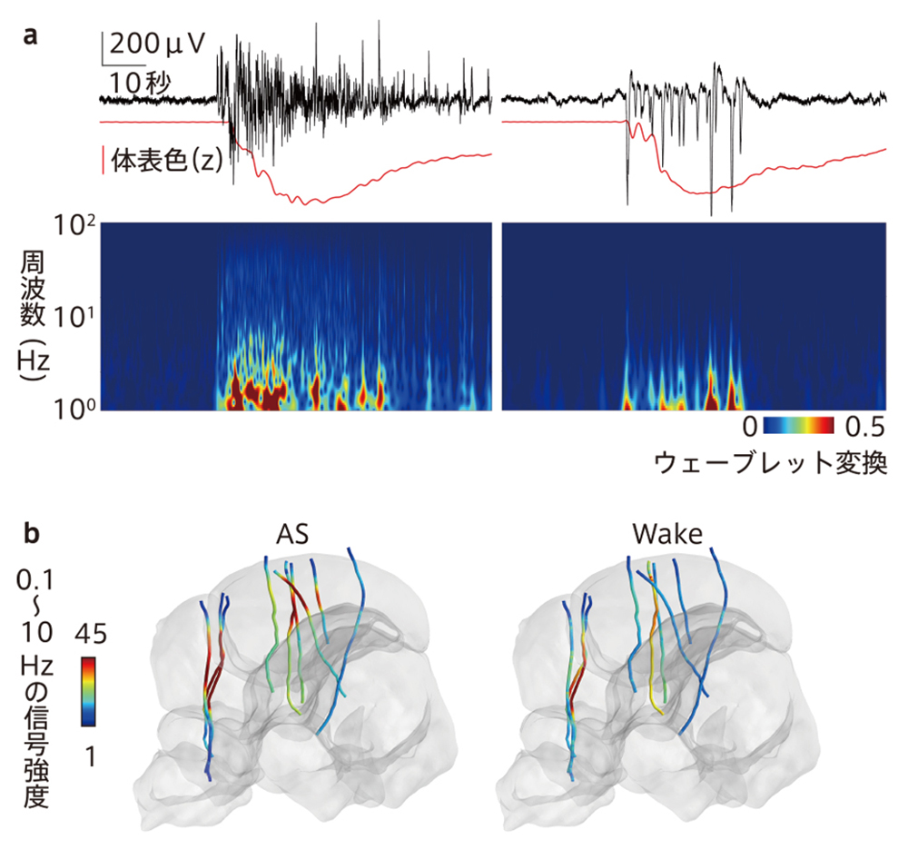 b 覚醒時とAS中の低周波成分(0.1〜10 Hz)のシグナル強度を各電極の記録位置と共に示す。暖色が高強度、寒色が低強度。9個体からの記録を単一の標準脳に重ねて示している。