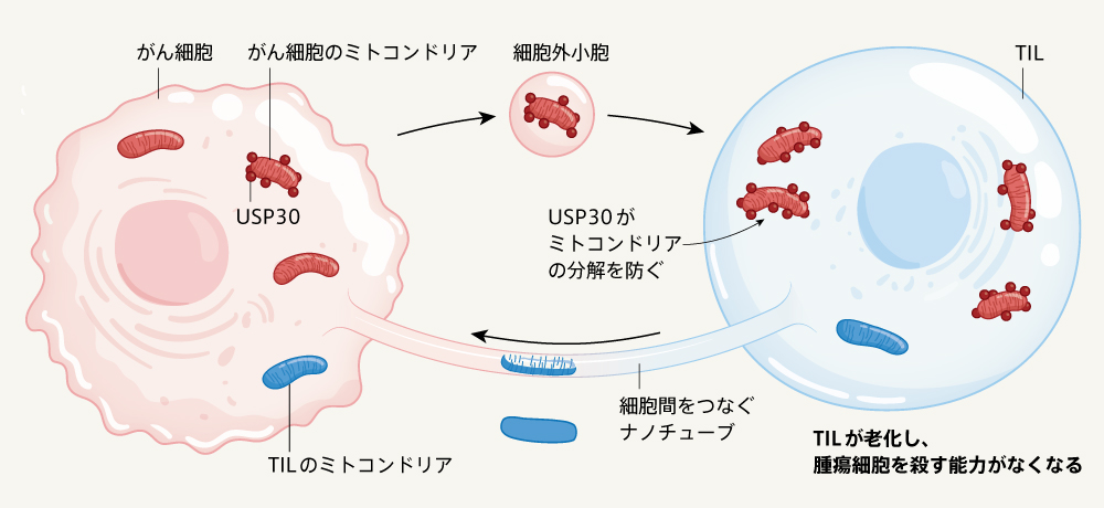 がん細胞とTILの間では、双方向にミトコンドリアが伝播している。がん細胞由来のミトコンドリアはUSP30と共伝播するため、ROS存在下でもマイトファジーを免れる。一方、TIL由来のミトコンドリアはマイトファジーによって分解されてしまうため、がん細胞のミトコンドリアがTILのミトコンドリアに置き換わることはないと考えられる。